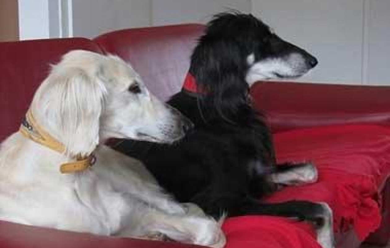 Deze twee gecastreerde saluki’s verloren hun huis omdat hun baas overleed. De baas had aan zijn kinderen voor zijn overlijden laten weten dat de honden samen geplaatst moesten worden.