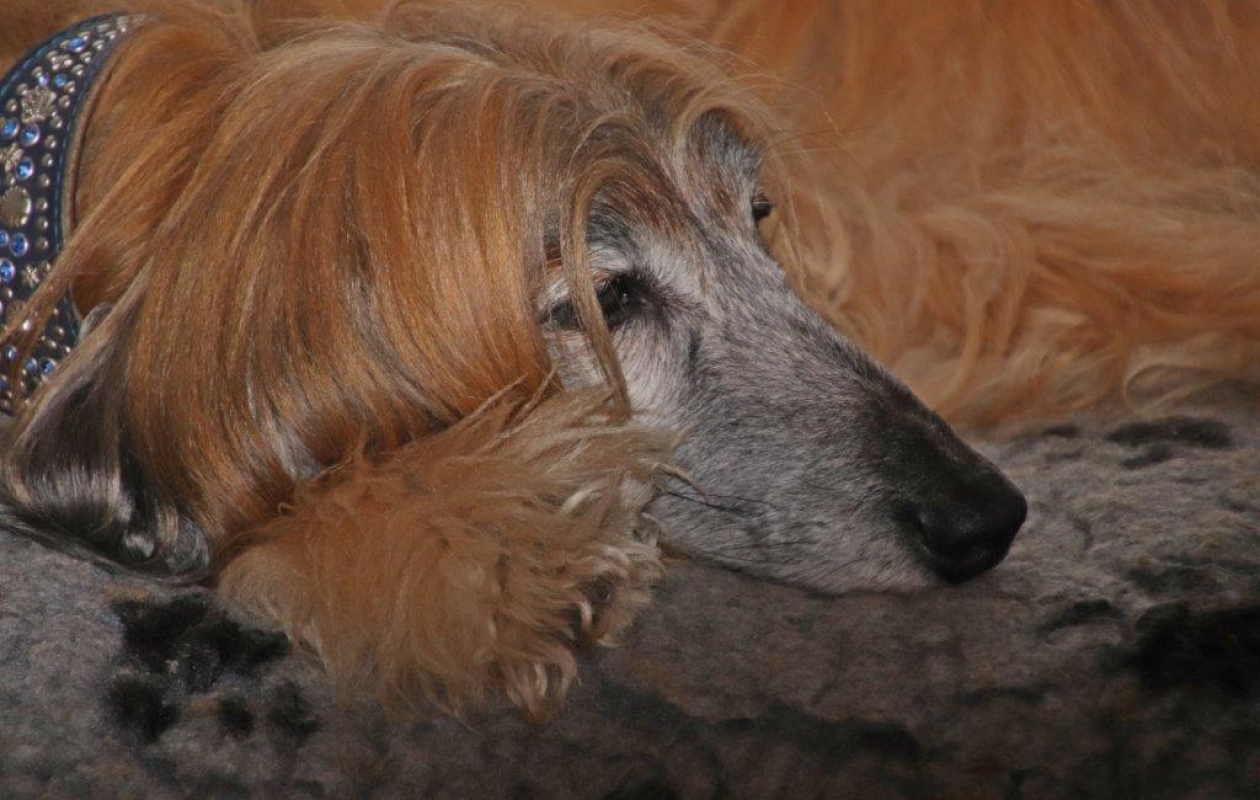 De ontvangst bij het nieuwe vrouwtje was allerhartelijkst. Ook daar was de vorige Afghaan tamelijk kortgeleden overleden, maar in verband met de leeftijd van vrouwtje leek een pup niet een goed idee en ze was dan ook meer dan verrast dat ze zo snel en onverwacht een Afghaan van middelbare leeftijd een goed huis kon bieden. De chauffeur genoot van de koffie, de taart en de verhalen over de vroegere Afghanen. Hadarah had intussen de keuken ontdekt en deed een Afghanendans langs het aanrecht. Je kunt nooit weten wat je daar aantreft…..